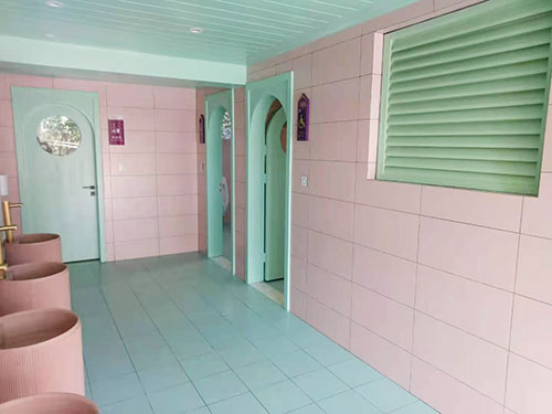 講完了他的核心處理技術,再來看一下里面的內室裝飾,哇,是不是圓了你的小公主夢,芭比粉的墻壁,粉色的洗手盆,金色的洗手龍頭,紫色的標識牌,充滿夢幻的拱型門。怎么樣是不是狠狠的滿足了一次兒時的少女心,如果不說它是一座廁所,是不是有一種很想住進來的沖動。